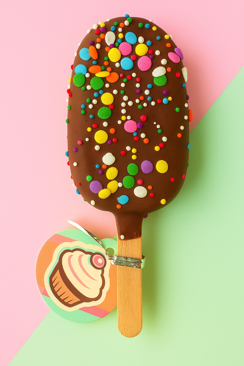 Chocolate popsicle adorned with pastel colored decorations and a smooth, rich chocolate coating for a delightful treat.