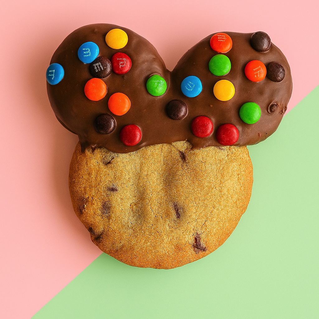 Enjoy our Mickey-shaped Chocolate Chip Cookie soft, chewy, packed with chocolate chips, and dipped in creamy chocolate for extra sweetness and charm.