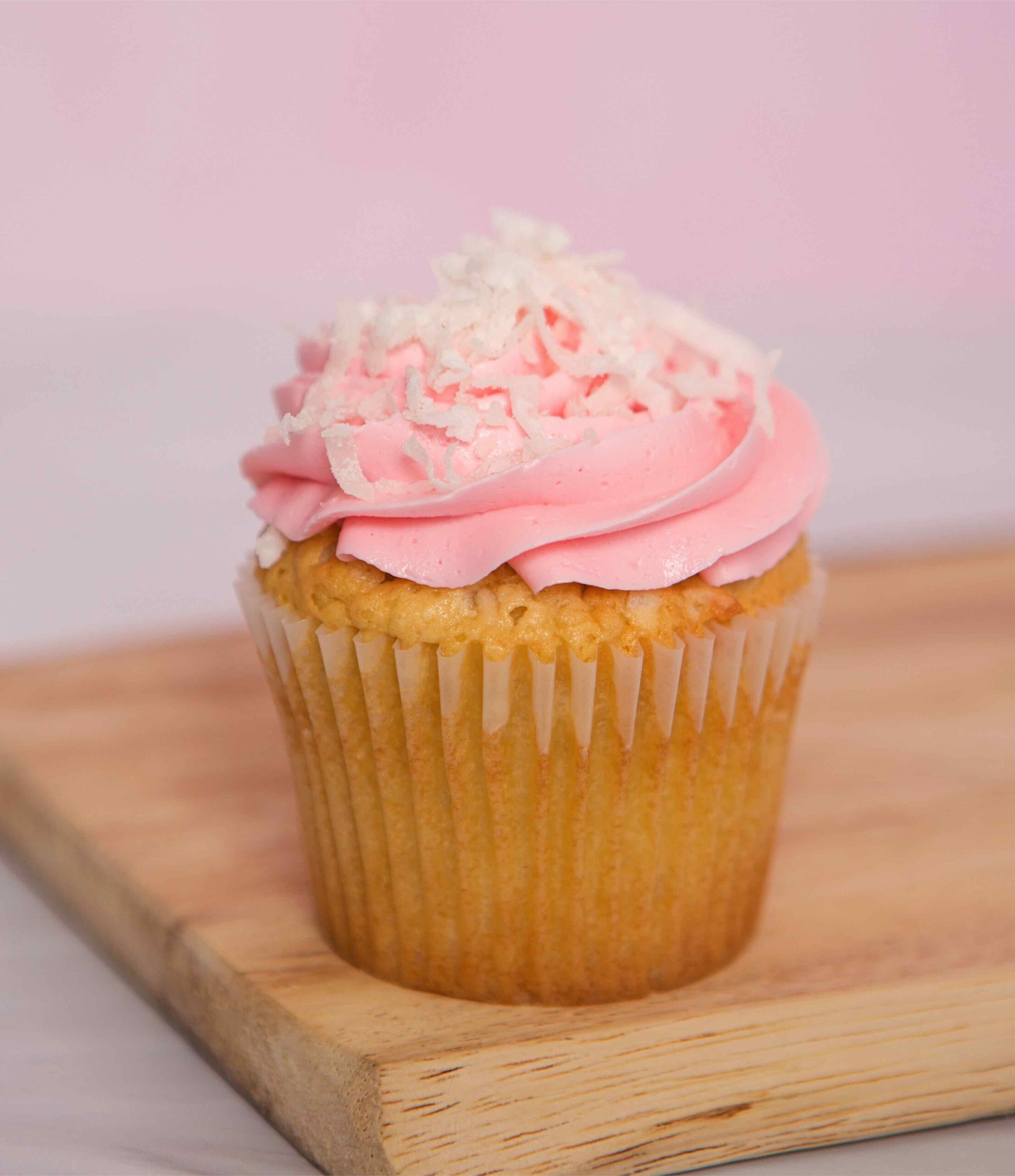 coconut cake with pink vanilla buttercream and coconut flakes