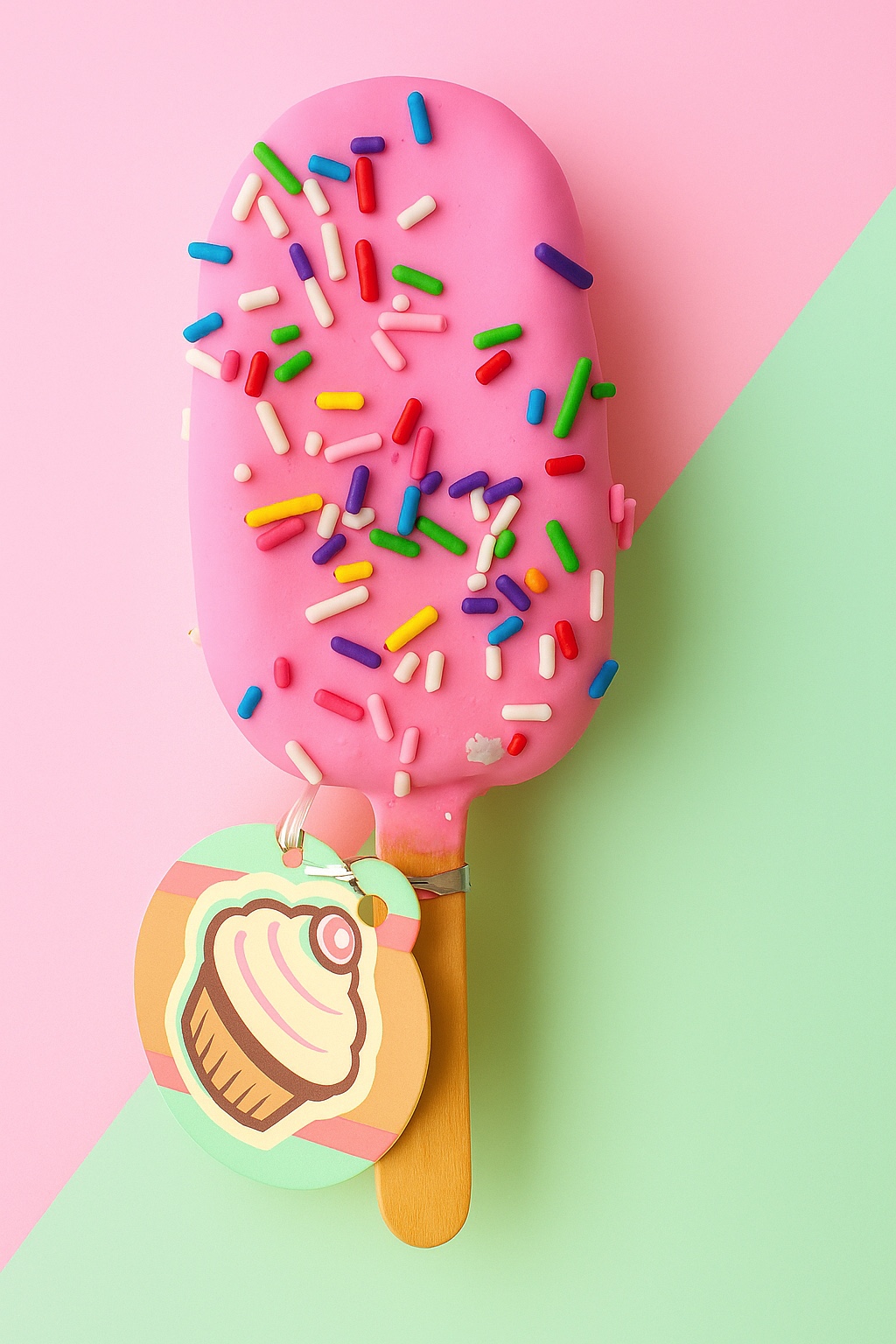 Chocolate popsicle adorned with pastel colored decorations and a smooth, rich pink chocolate coating for a delightful treat.